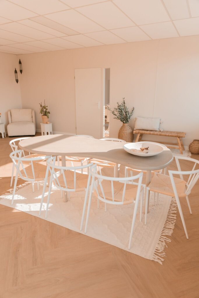 Studio Marrakesh is een fijne ruimte die extra ruim oogt door de lichte meubels en licht inval. De cactussen en Marokkaanse elementen laten je even in Marrakesh wanen. Er staat een tafel met 8 stoelen (er zijn 4 extra stoelen aanwezig), 2 sofa’s, een lounge stoel en een bankje. Deze studio is ideaal voor coaching, familieopstellingen, workshops of kan als lunch ruimte gebruikt worden tijden One Day Retreats of langdurige workshops of ceremonies.
